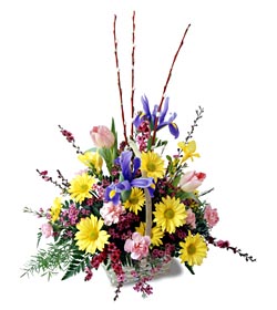 A dynamic mixture of pink, yellow and blue blooms, plus greens. A great gift for any welcome occasion.